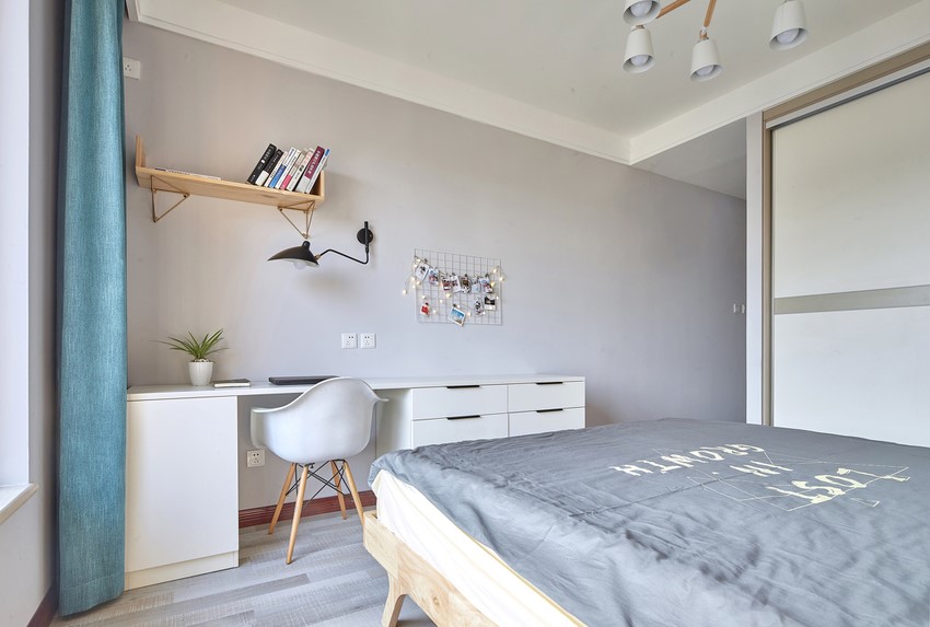 背景墙做了简单的灰色,艺术画作为背景装饰,整个实木的床和床头柜的设计更让人喜欢,温馨舒适,床尾正对着的梳妆台,也是办公桌。