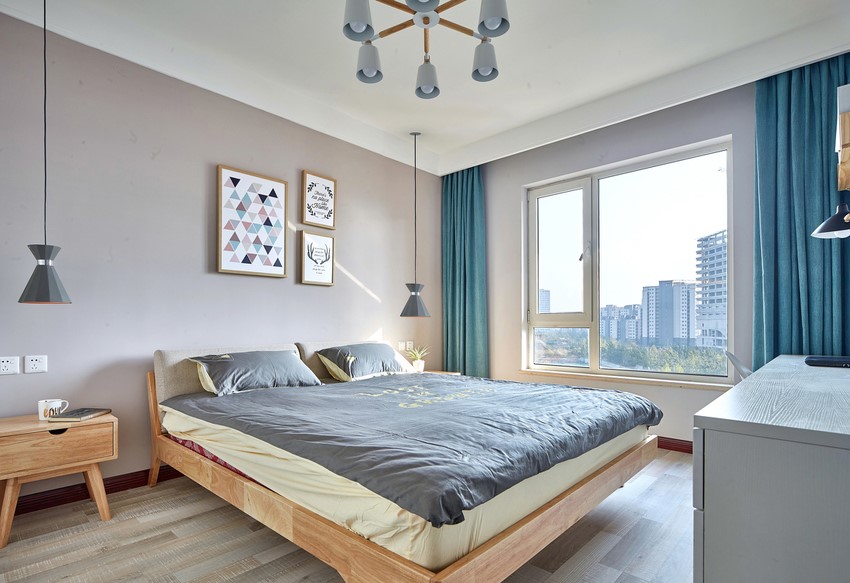 主卧室,虽然没有阳台,但是卧室的采光非常好,带有个大面积的玻璃门窗,现在越来越多家庭都会在卧室或者是客厅的阳台安装类似的全景玻璃窗,当然不仅仅只是为了透光,更是为了享受高层的风景。