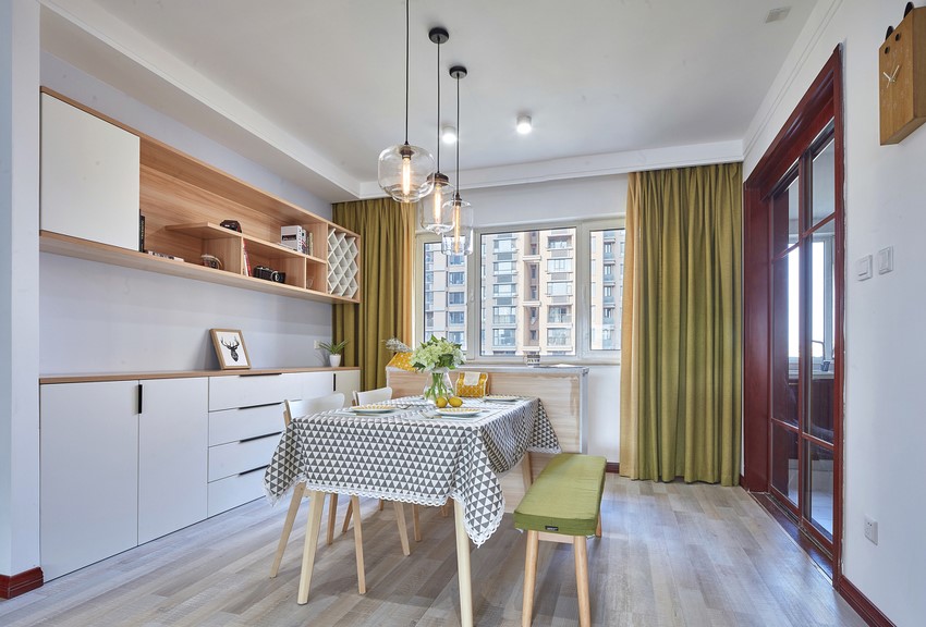 餐厅,整个餐厅的空间比较大,实木的地板温馨舒适,搭配实木的餐桌以及餐椅,就连定制的餐边柜也都是实木的材料,整个空间给人的质感很舒适高档,简约又大气,色彩的搭配更偏向于自然色,再加上本身带有个大窗户,所以采光也非常的好。这样的南北通透的户型是比较让人喜欢的,家里人看到都非常喜欢。