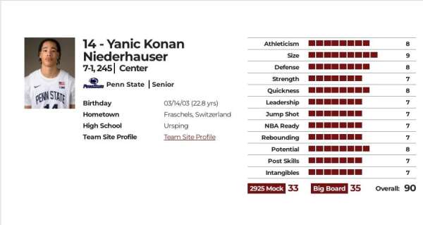 优点:这位大器晚成的瑞士内线拥有顶尖的臂展和令人期待的潜力,擅长篮下终结和盖帽,运动能力十分出色,最大垂直弹跳达到94厘米,是集身高、弹跳、移动能力于一体的完美结合体,拥有出色的身体素质,虽然显瘦但很结实,能在不影响动作流畅性前提下持续增肌,他在宾夕法尼亚州立大学打出突破性赛季,场均出战25分钟,贡献12.9分、6.3个篮板、2.3次盖帽,投篮命中率高达61%,高效的空中接力选手,无论是在转换进攻还是挡拆配合后都能完成空中接力,跑动积极,擅长篮下终结,在篮筐附近的接球攻技术以及低位进攻都还处于雏形阶段,虽然不成熟,但脚步和手感展现出一定成长潜力,罚球动作流畅,66.4%的罚球命中率表明还有提升空间.