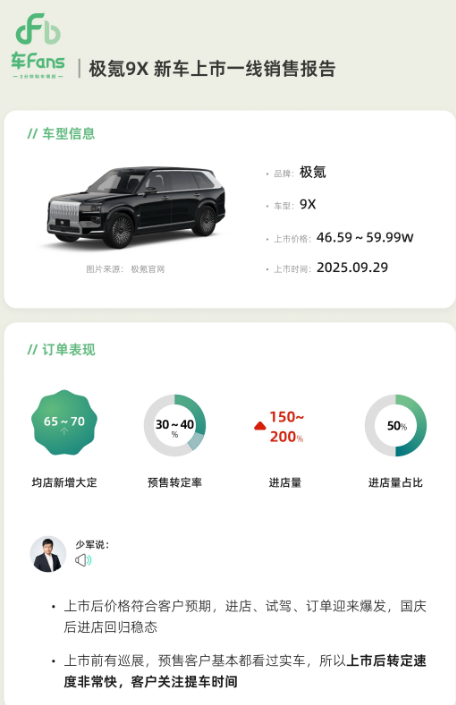 国庆后的一份“捷报”:极氪9X平均每店新增大定65-70台,尤其是预售转定比例高达30-40%.,进店量上涨150-200%.....光是这一连串的销售数据,你能想象得到这是才上市不到半个月的新车嘛?