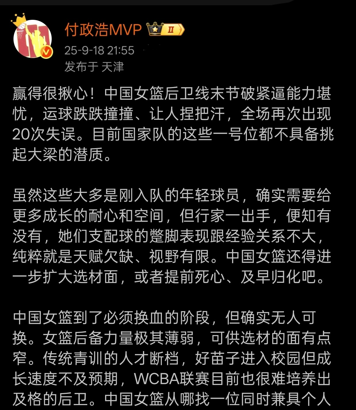 对此,著名篮球媒体人付政浩在比赛结束后第一时间发文为中国女篮出招,他表示:中国女篮赢球却很揪心!后卫线末节破紧逼乏力,全场20次失误,一号位无人能挑大梁。年轻球员支配球差,天赋、视野不足。后备力量薄弱,青训断档、校园人才成长慢、WCBA难出合格后卫,兼具攻击力与视野的控卫更加难寻,及早归化才是出路。