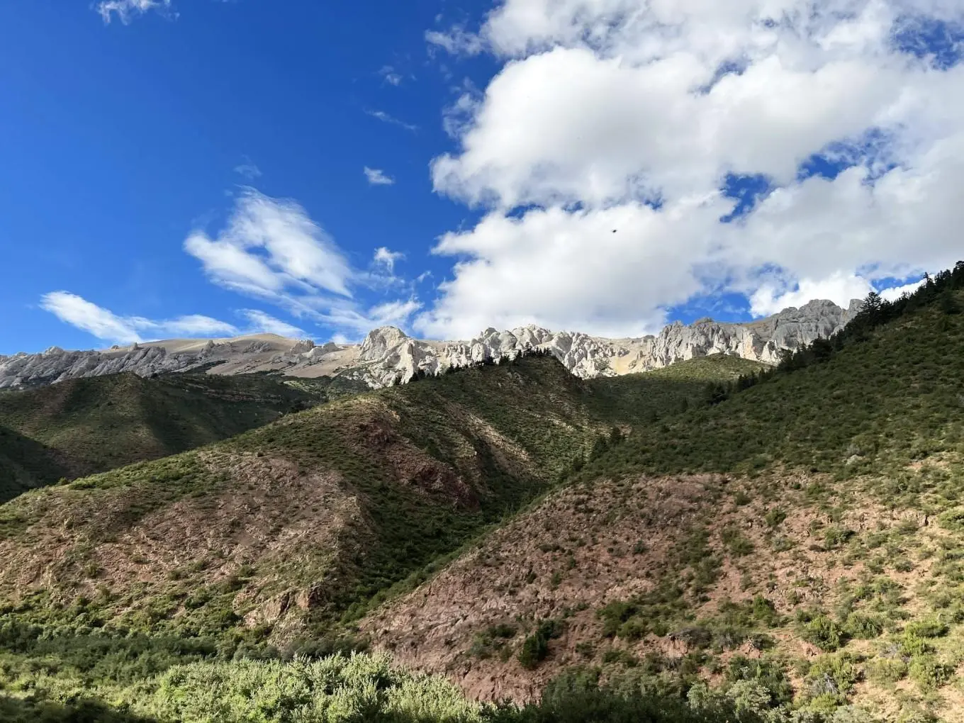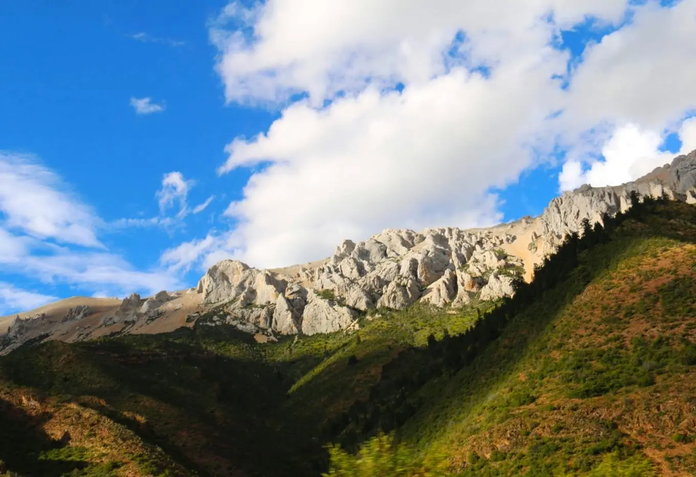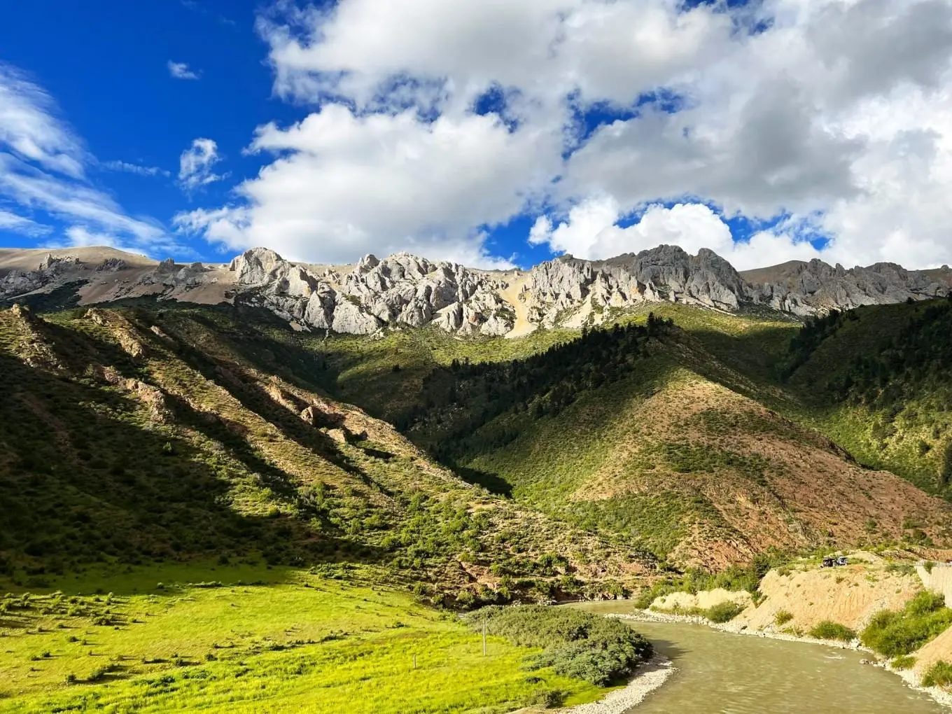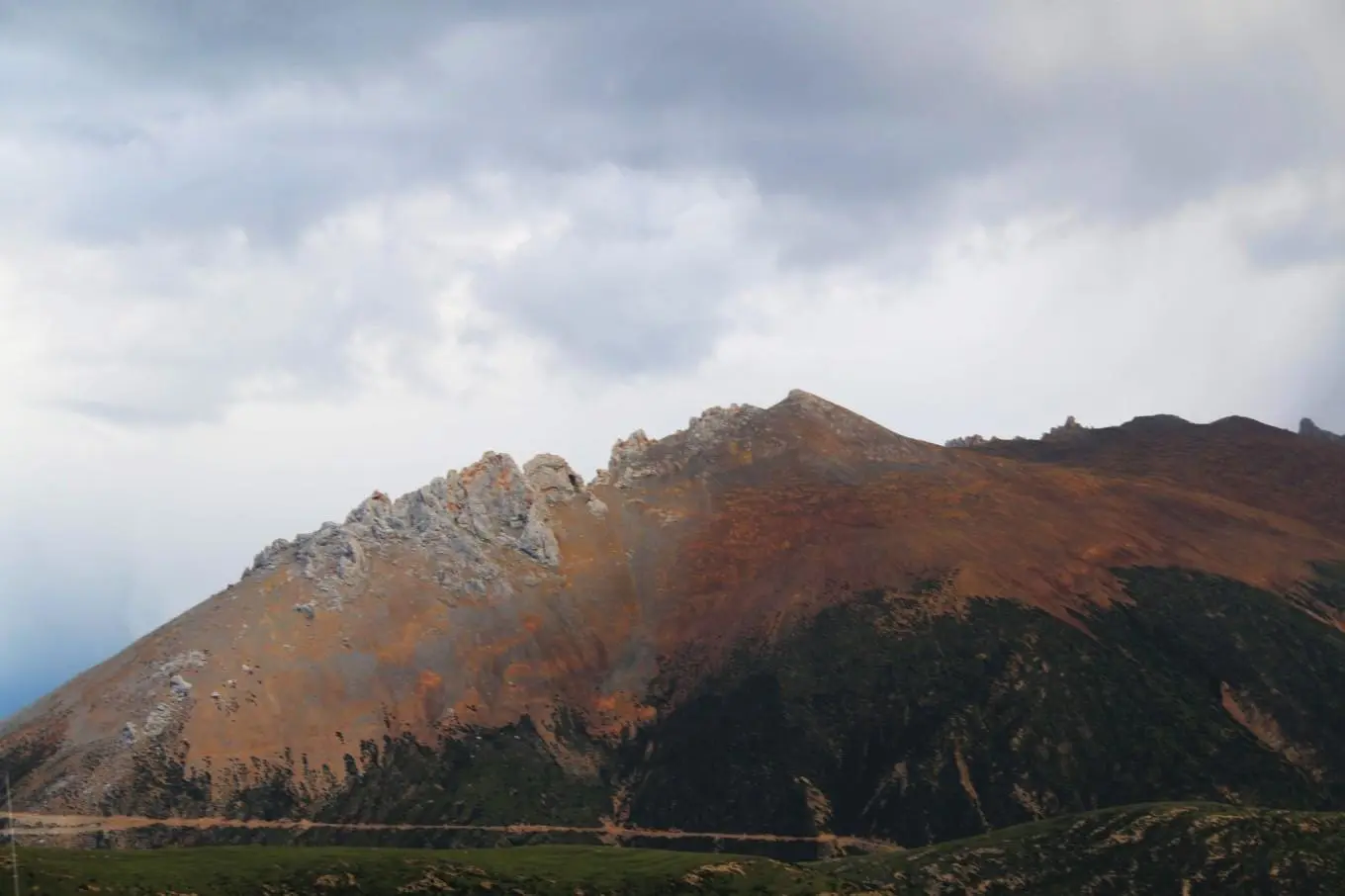 往上看业拉山口,山顶一片白色的山石耸立,和周边的景致形成巨大的反差,在藏族人民的心中,这些白色的山石一定是赋予神的美好寓意,