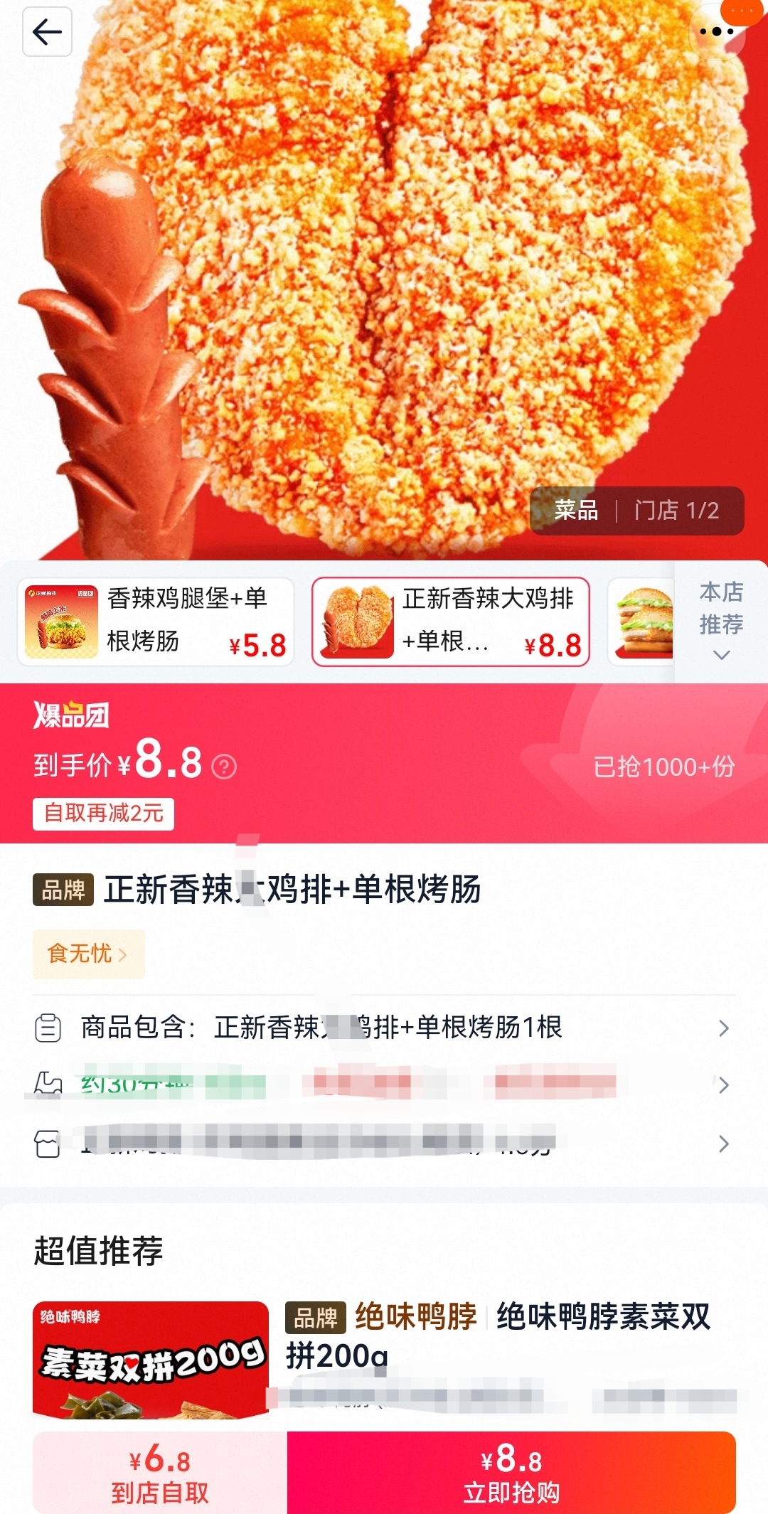 就在刚刚点开淘宝闪购,有一个爆品团的入口,前几天还是免运费,就是这个区域今天买了一个正新鸡排,多了一个到店自取的选择,免拼8.8,到店自取6.8更优惠了2元。