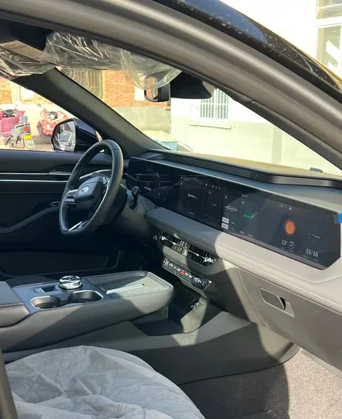 车身侧面还是那种溜背的造型,隐藏的门把手,新换的轮毂样式也挺酷。车尾的灯,仔细看有那么点福特野马的味儿,晚上点亮了肯定好认。还加了几个像红色、蓝色这种比较跳脱的颜色,算是给非黑即白的停车场添了点色彩。坐进车里,手能摸到的地方大多都是软的,做工也细腻。最吸睛的就是那个超长的大屏幕,科技范儿十足,但人家也没忘了用着方便,该留的实体按键也留着,这点挺实在。