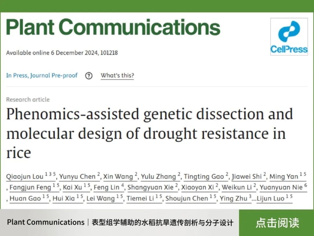 01在国际知名期刊Plant Communications发表论文《Phenomics-assisted genetic dissection and molecular design of drought resistance in rice》,系统揭示了表型组学辅助解析水稻抗旱遗传机制的新路径。