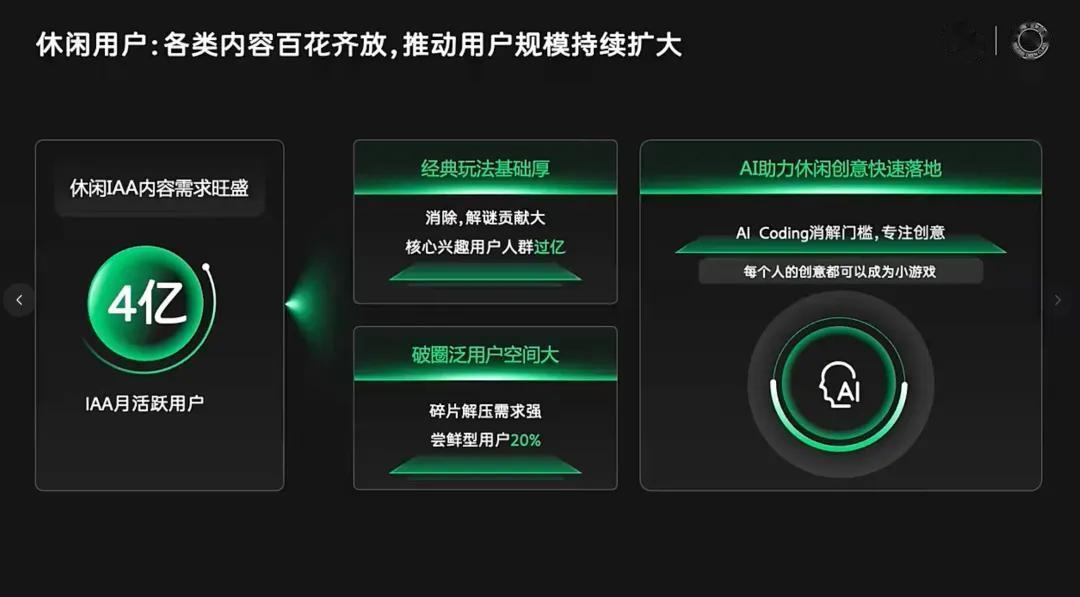 此外,在会前的采访中,李卿也提到,小游戏团队正在做AI Coding 的尝试,想让喜欢玩游戏的用户,能用自然语言生成比较完整的游戏,为平台带来更多内容创新,而休闲游戏则是 AI Coding 能够较先触达的范围。