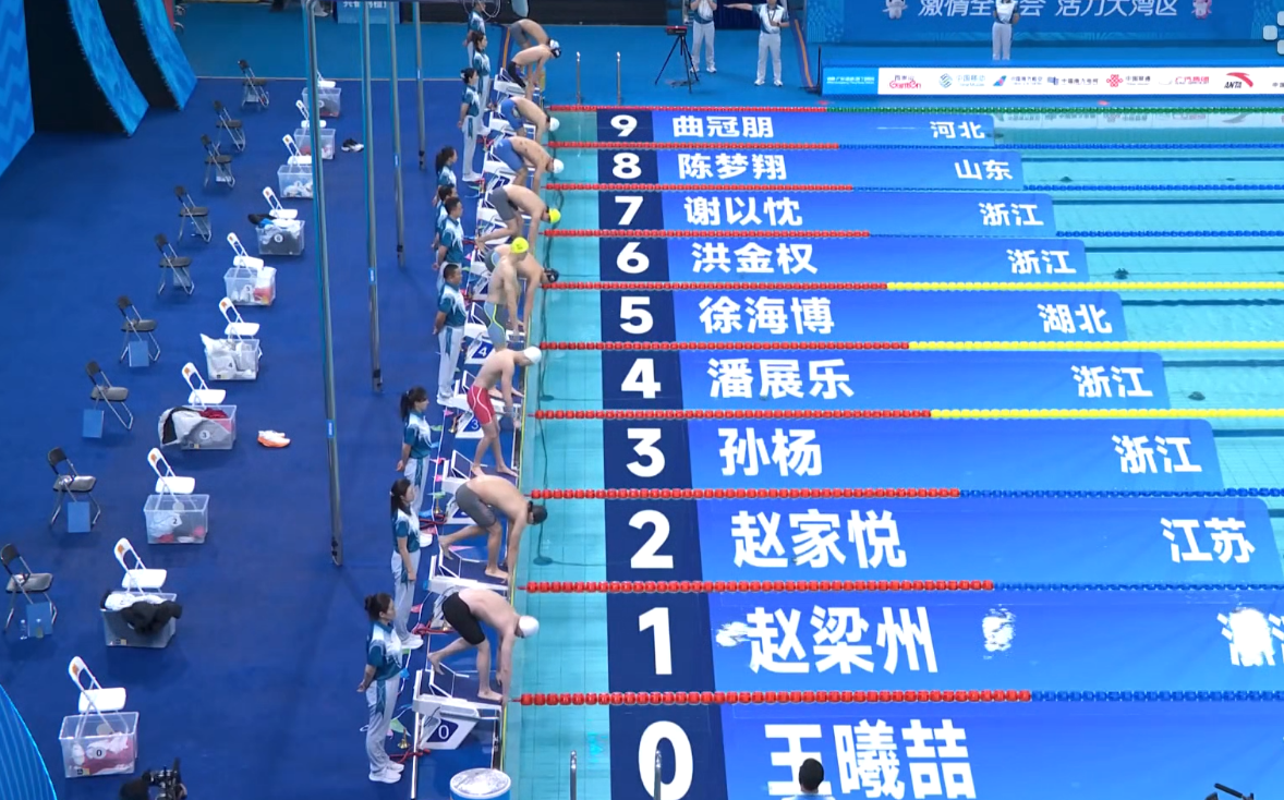 湖北选手王梓成也表现不俗,以54秒90的成绩完成比赛,总排名第二晋级。陕西选手姜呈霖游出55秒07,总排名第三晋级。浙江老将汪顺56秒07,总排名第九晋级。