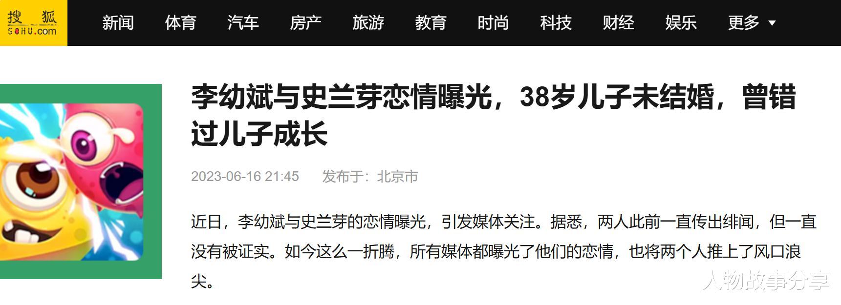 搜狐娱乐2023-06-16李幼斌与史兰芽恋情曝光,38岁儿子未结婚,曾错过儿子成长
