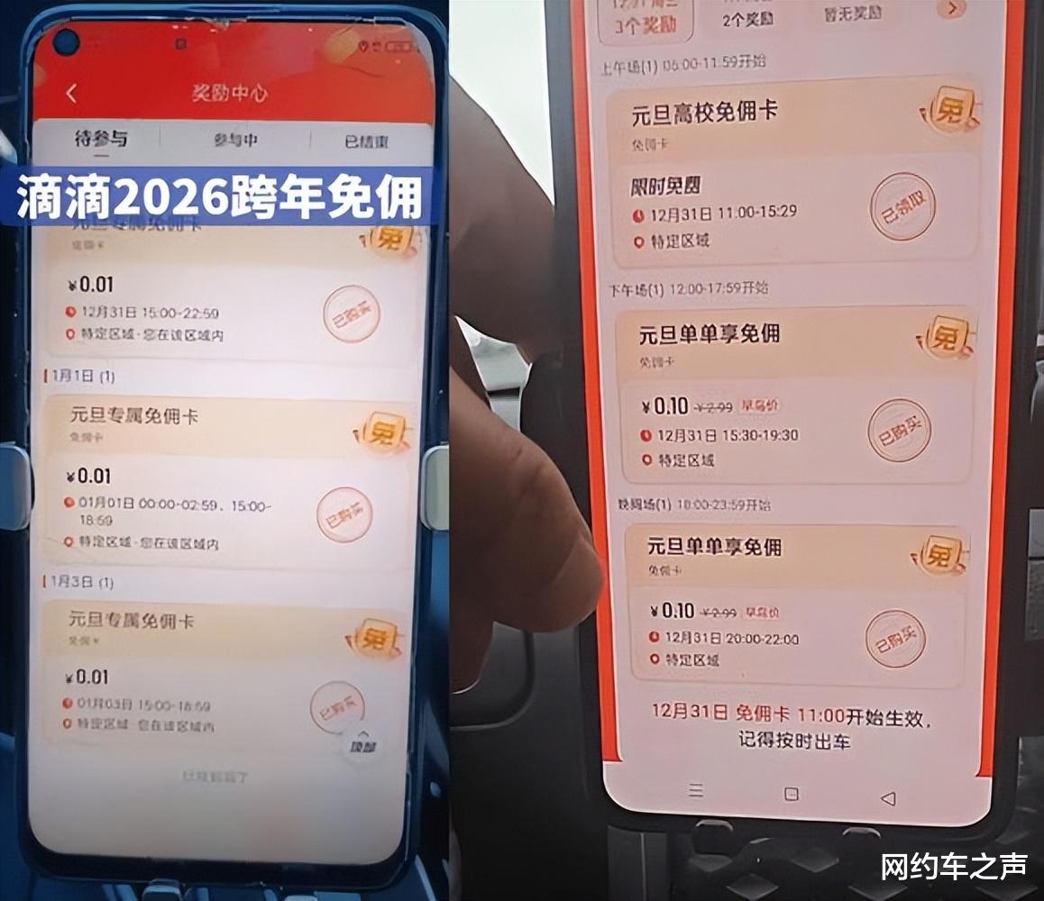 为了应对元旦假期出行高峰,各大平台纷纷推出奖励措施。滴滴在天津、青岛、济南、广州、深圳、东莞、成都、石家庄等245多个城市上线了免佣卡,12月31日至1月3日期间,单日累计生效时长最长可达12小时。