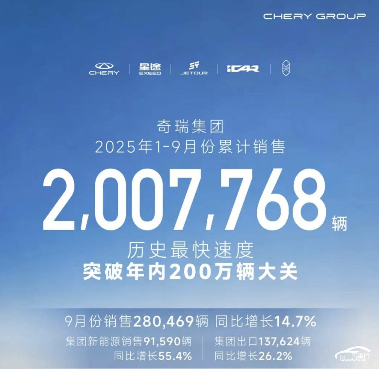今年以来,奇瑞集团的市场表现可以用高歌猛进来形容。数据显示:1-9月,奇瑞集团累计销量为200.78万辆,创下历史最快速度突破年内200万辆大关。而刚刚过去的9月,奇瑞集团销量280469辆,同比增长15%。这其中,海外销量达到了137624辆,同比增长26%;新能源汽车销量91590辆,同比增长55%。