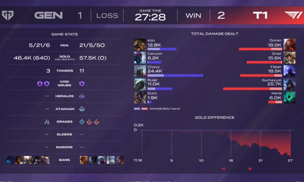 第一局,双方围绕打野展开了前期较量。T1针对中路取得成效,而GEN则凭借下路对线优势掌控节奏。然而,Faker两次被杀导致队伍断了节奏,0-3的Chovy却在疯狂发育,一度领先了60个补刀。比赛僵持不下时,GEN在上路和下路同时拿下击杀,掌握了主动权。决定胜负的第二个关键点发生在20分钟的龙团,GEN在缺乏视野的情况下冒险进入龙区,Chovy的奥莉安娜大招命中T1五人,配合巴德大招完成0换5的梦幻团战。GEN借此拉开金币差距,拿下第一局。
