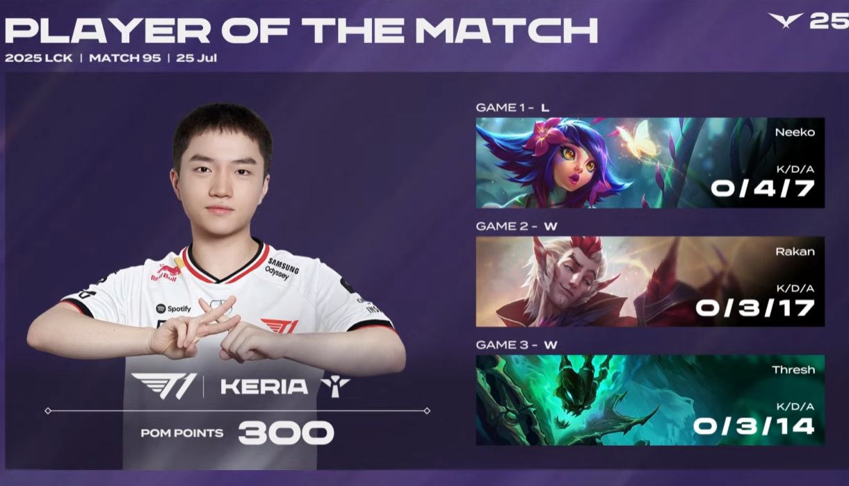 但T1的调整速度也很快,因为下路组合的竞技状态很好,队伍在后面两局都是围绕下路来打,让Gumayusi拿到了霞和厄斐琉斯这种大核英雄。而Gumayusi也没有辜负队伍的期望,在队友帮助下取得对线优势,团战也是打满了伤害。事实上,第一局他的库奇抢大龙也为T1续命了,只是前期阵容没有打出足够大的优势,后期的伤害明显不足。Keria的这个最佳选手POM没有太大问题,毕竟ADC的输出环境是靠辅助创造,第二局上路的关键团战和第三局锤石的钩子,都发挥了巨大作用。