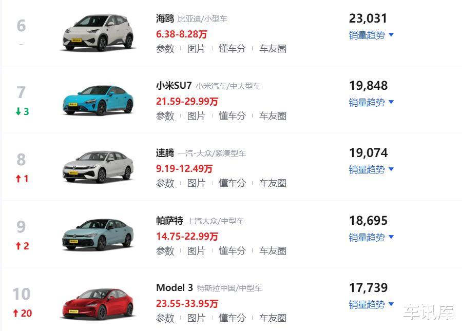我们再来看看排行榜6至10名的车型,整体的销量排名变化还是比较大,销量成绩也普遍不错。比亚迪海鸥也是再次稳居排行榜第六名,月销量达到23031辆。作为一款小巧灵活的小型家用轿车,再加上全新智驾的加持,使得该车的购买性大大提升,成为了许多家庭的第二辆代步车。小米SU7的月销量出现大幅度下滑,销量排名也是跌落至第七名。此次小米SU7的销量下滑,不知道是因为给YU7让产能,还是受到其它品牌的车型影响。大众速腾的销量为19074辆,销量排名也是提升至第八名。伴随着新款大众速腾L的正式预售,现款大众速腾也是加大了优惠力度,许多朋友也是果断下手。