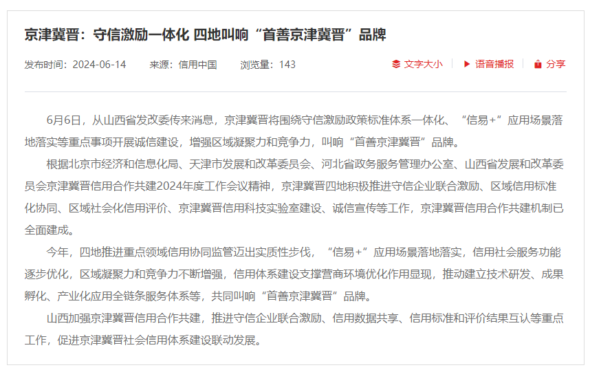 近日,京津冀晋四地联合发布消息,宣布将进一步深化守信激励政策标准体系一体化建设,加速推进“信易+”应用场景落地,共同打造“首善京津冀晋”诚信品牌,以诚信建设增强区域凝聚力和竞争力。