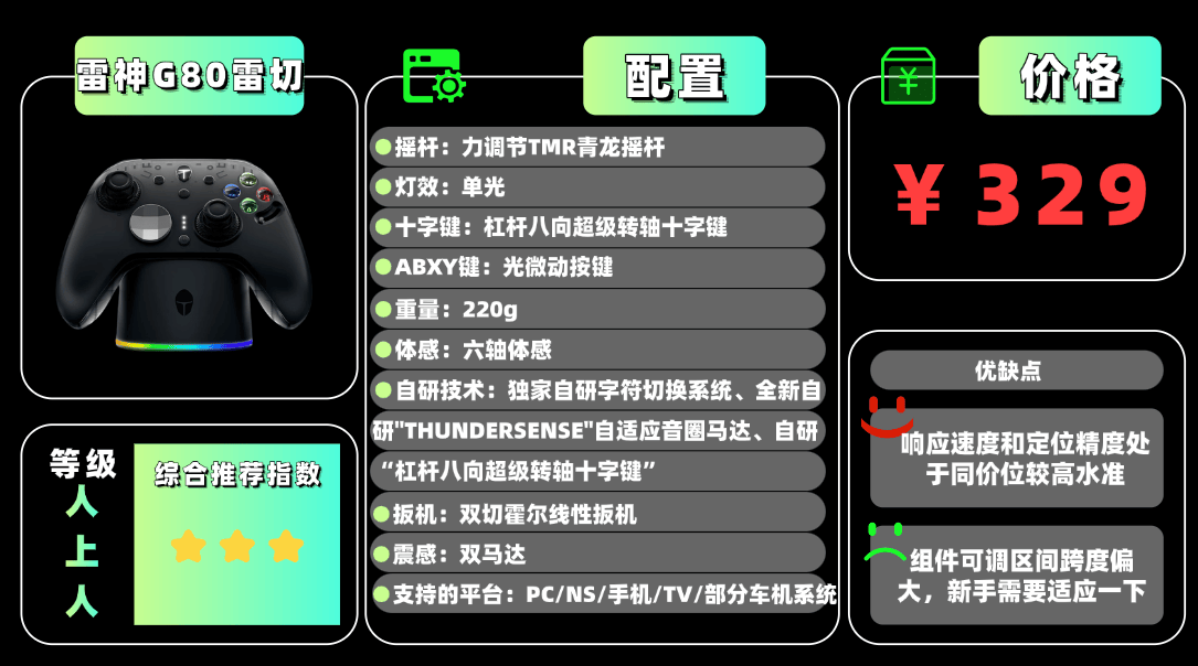 功能方面,手柄支持有线、蓝牙和2.4G三模连接,可兼容PC及主流游戏平台。雷云4软件可自定义额外按键、灵敏度滑块、死区以及防双重死区补偿,实现精细化操作。轮询率为1000Hz,确保输入延迟低。扳机可在霍尔线性(长键程)与微动(短键程)模式间切换,结合灵敏度滑块,在赛车或狙击操作中提供较好的精度控制。