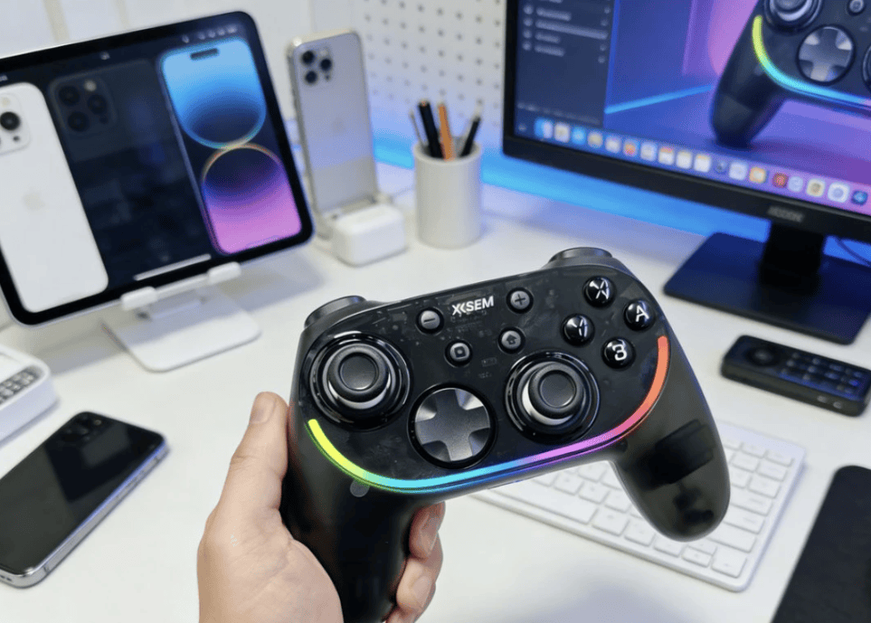 这款手柄在握感取向上偏舒适路线,机身弧度自然,连续操作时不容易产生明显疲劳感。外观提供多种配色选择,整体不张扬。摇杆采用TMR结构后,中段控制更连贯,回中稳定,细小角度的准星修正比较好掌控,但默认阻尼设定偏轻,手感偏灵敏。双模式扳机在不同游戏中能体现出清晰差异,背部四键支持独立编程,对需要频繁连段或功能切换的游戏比较友好。RGB灯效可玩性高,不过在暗环境下存在亮度偏强的问题。