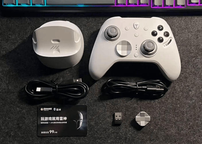 功能上支持有线、蓝牙和2.4G三模连接,可在PC、Switch和移动设备间切换,内置860mAh电池续航稳定,可搭配倾斜式充电底座使用,拿起即连接,放下自动休眠,底座稳固且不受拉扯影响。H桥驱动配合加大转子马达提供细腻震动反馈,软件支持回报率、摇杆死区及补偿、按键映射和宏功能调节。