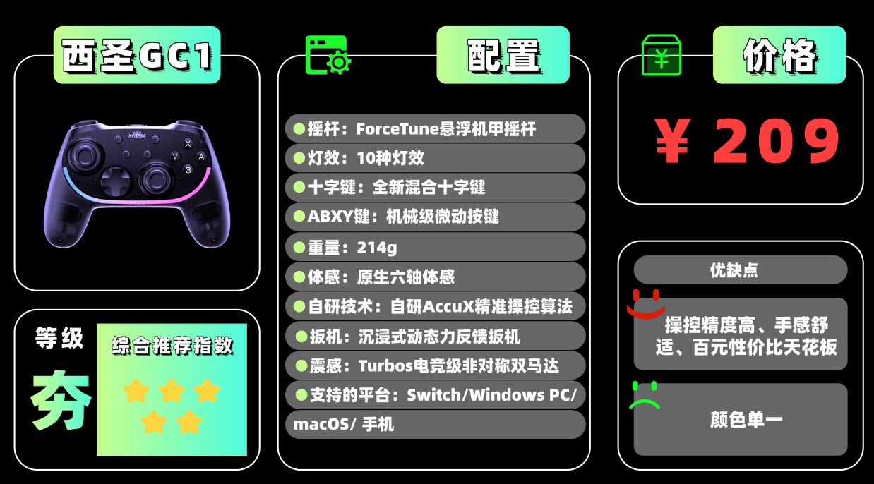 核心主流趋势品牌——1. 西圣GC1:口碑爆款,圈粉无数,电竞操控标杆,专注百元价位旗舰配置与全平台高性能,综合性能领先,适合各类玩家。