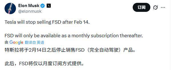 此前官方已确认,2月14日后新用户将无法再以一次性付费形式购买FSD,美国市场已明确订阅定价:已购增强型自动驾驶套餐的用户享99美元/月优惠价(约合人民币689元),普通用户订阅价为199美元/月(约合人民币1385元)。中国市场目前仍维持6.4万元的买断价,暂未上线订阅服务,业内预计后续订阅定价将在499-699元/月区间。