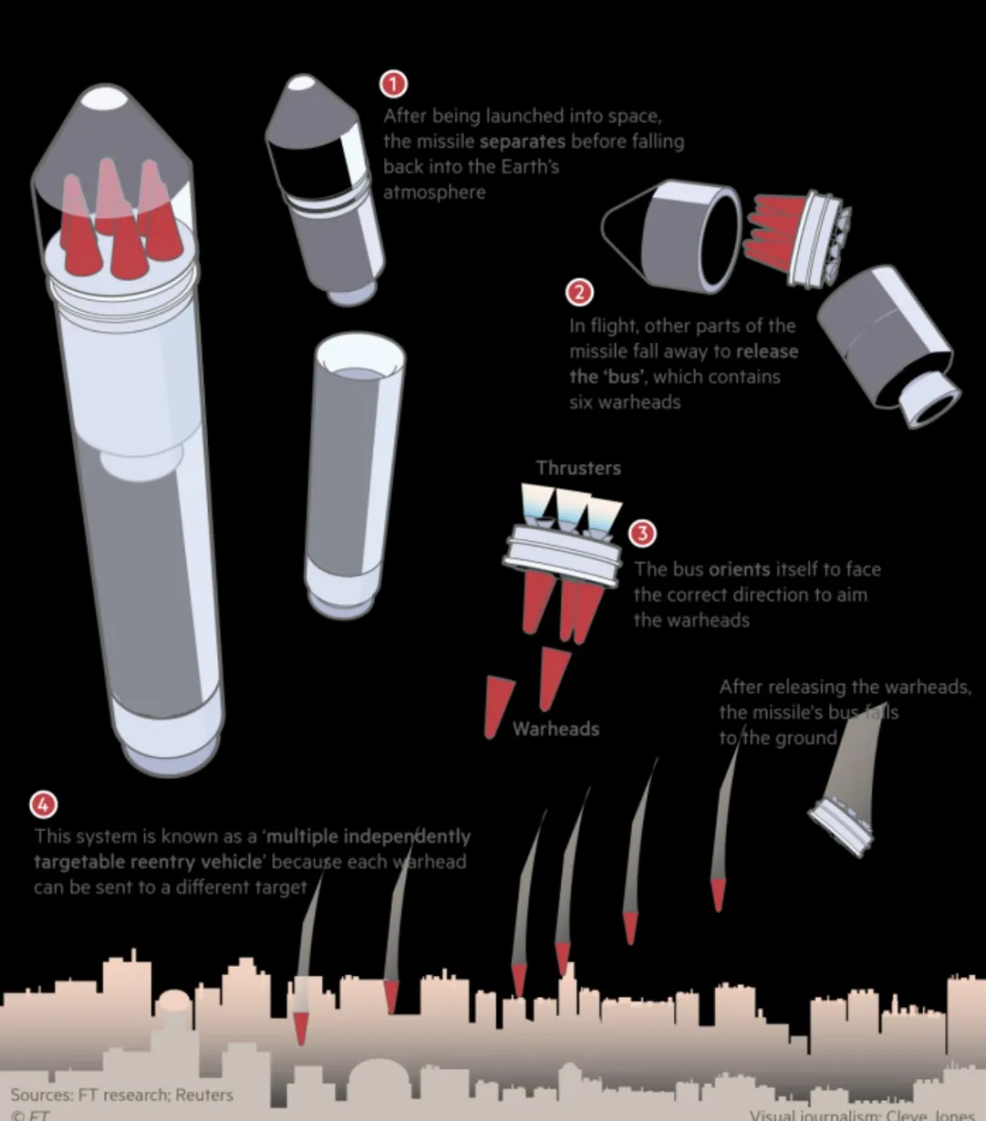 超过 10 马赫的设计速度在 75–100 公里高度进行末段滑翔使用 MARV 分导式多弹头技术也正因为如此,目击者看到的不是一次爆炸,而是类似流星雨般的多点热辉光。
