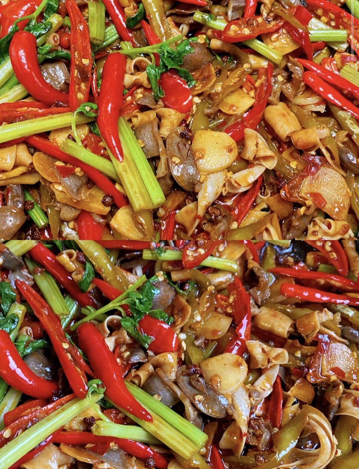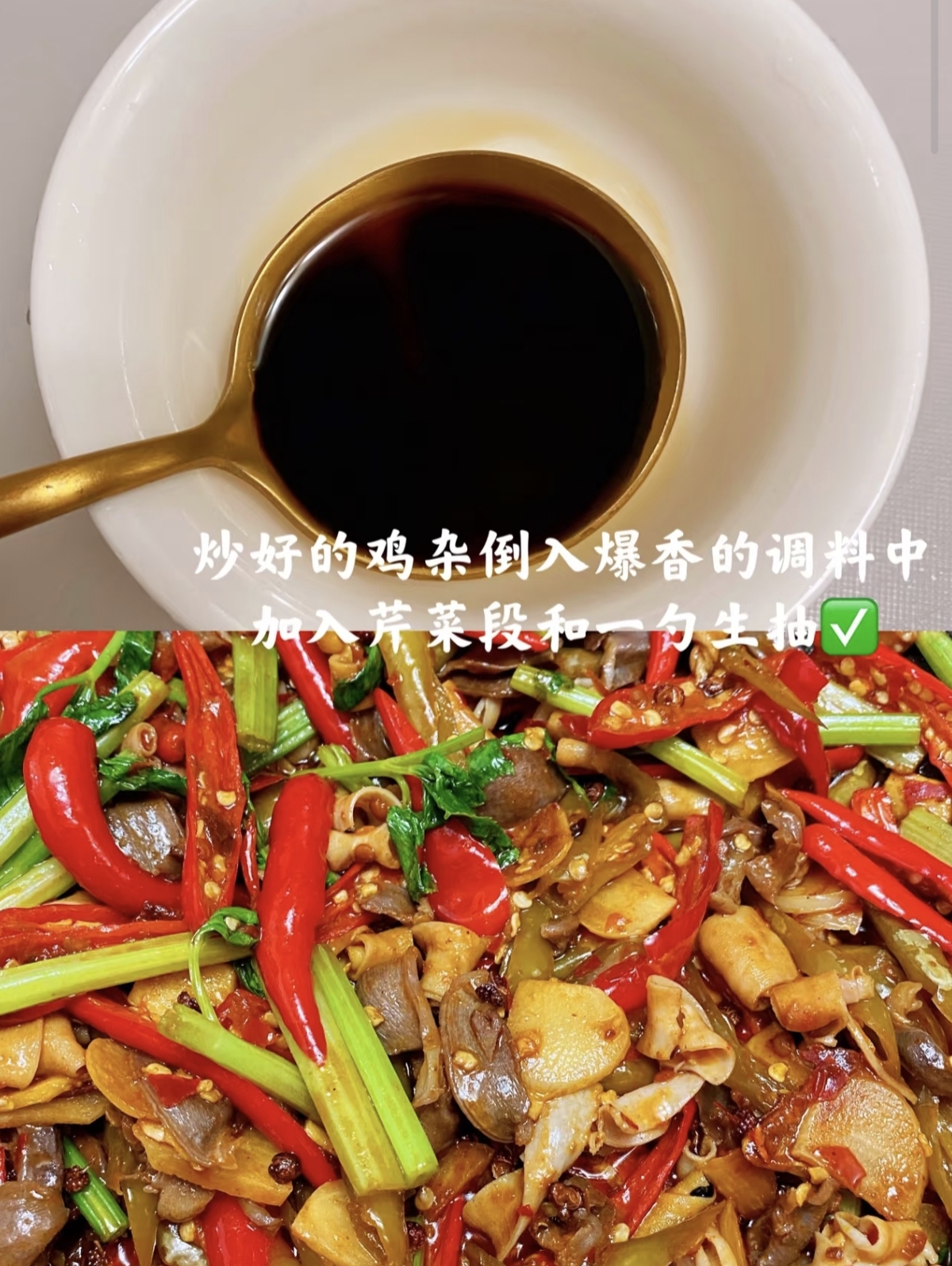 混搭技巧:鸡杂回炉,迅速裹挟酱香,与芹菜段相结合,完成最后的点睛之笔。