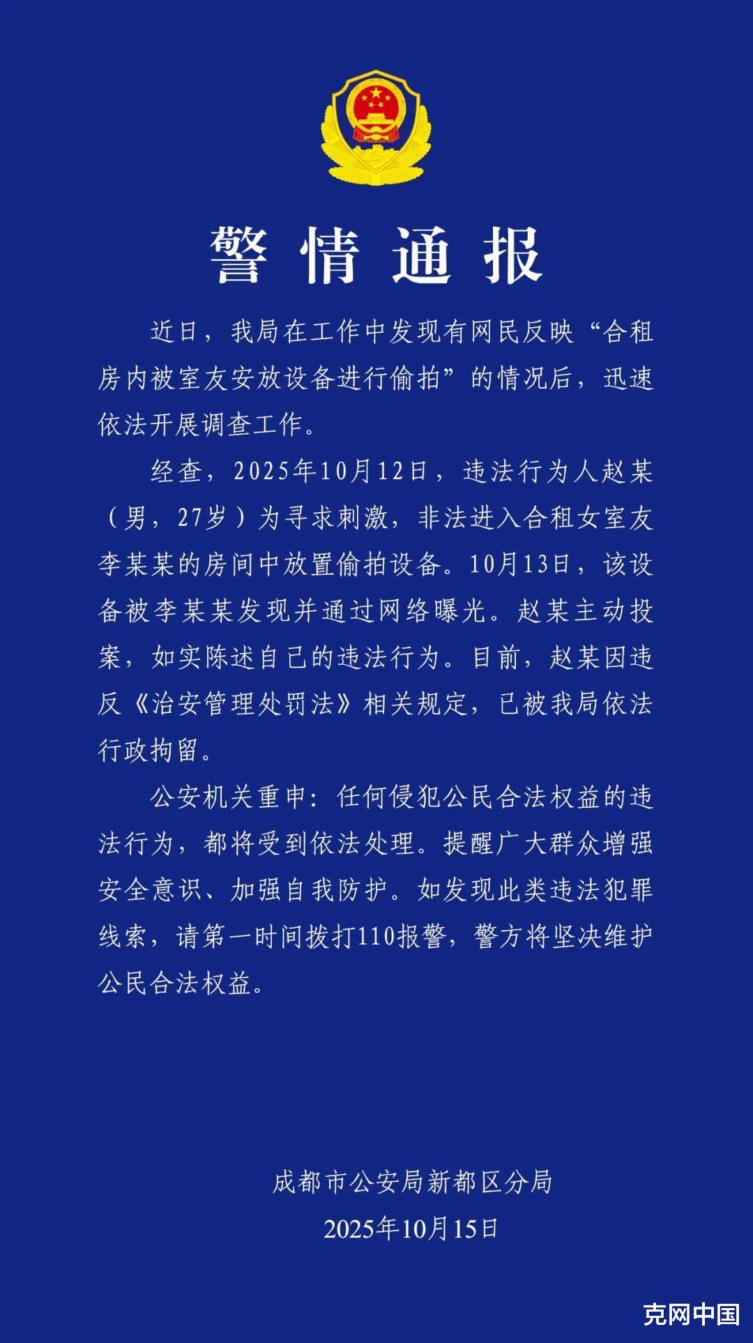 一、合租房里的“信任陷阱”10月15日,成都警方通报了一起令人愤怒的事件。27岁的男子赵某,为“寻求刺激”,竟非法闯入合租女室友李某某的卧室,安装偷拍设备。10月13日,设备被女生发现后曝光。赵某随后自首,被依法行政拘留。