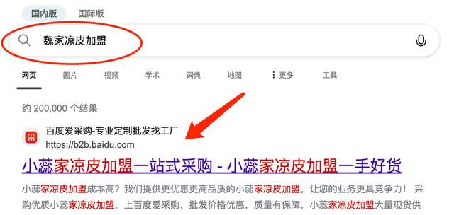 然而,就在魏家凉皮以实体门店和标准化运营赢得市场认可的同时,其品牌线上入口正面临严重的截流危机。不仅核心品牌词“魏家凉皮”被竞品与山寨商品公然拦截,就连关键业务词“魏家凉皮加盟”的流量,更是被竞争对手的广告精准抢占,导致品牌宝贵的线上客流被严重分流。