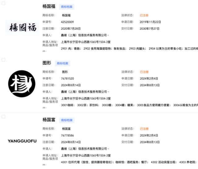 同样以“品类+姓氏”为核心模式的杨国福,在品牌保护方面展现出更为系统与前瞻的布局。在传统商标领域,杨国福不仅完成了“杨国福”及相关图形商标的多类别注册,还主动对“杨国富”等近似商标进行防御性注册,有效防范品牌混淆和搭便车行为。