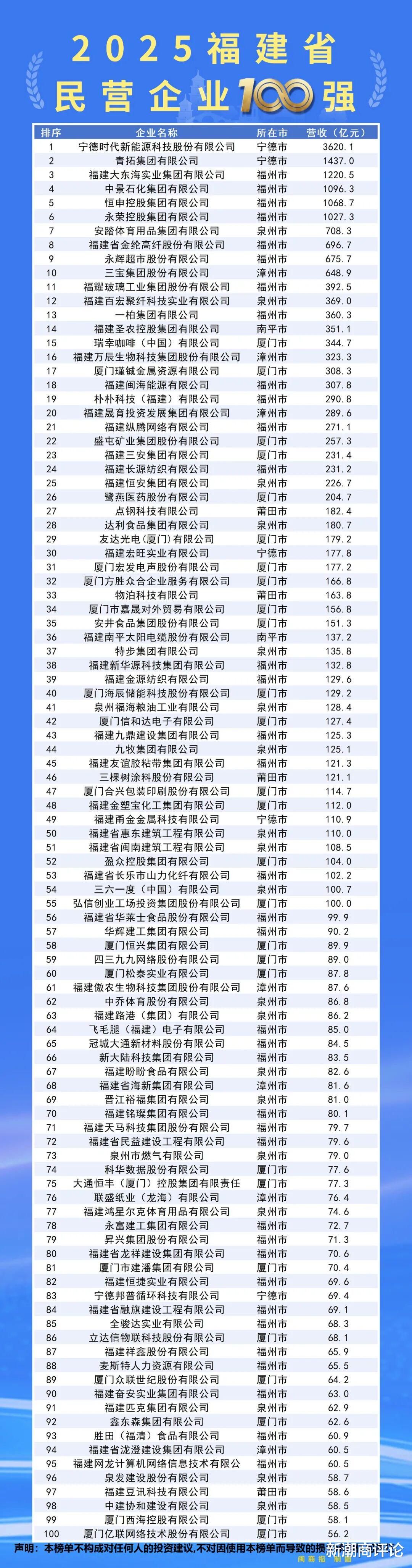 宁德时代稳居2025福建省民营企业100强、制造业民营企业100强、创新型民营企业100强等3个榜单榜首。去年实现营收3620.1亿元,同比减少9.7%;净利润507.45亿元,同比增长15.01%。