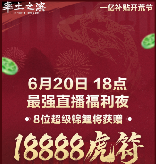 瓜分大奖的时候,也不要忘了错过直播间的精彩节目。由诸多顶流主播组成的宠粉天团强势来袭,陪你一同征战开荒节。在6月20日,《率土之滨》官方直播间还将直接送出两千万虎符。虎符雨哗哗直下,直播间持续掉落88、388、588、888虎符,名额有限,先到先得。同时还有8位超级锦鲤获赠18888虎符大奖,直接走向人生巅峰。在直播间下单的率批们同样有超值回馈,说不定就能拿下下单金额250%的虎符暴击补贴!