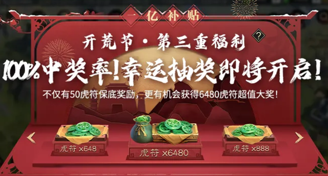 还没完,开荒节第三重补贴也已准备就绪,幸运抽奖中奖率高达100%,绝对不会让你空手而归。来就能领50保底虎符,运气一来直接膨胀到648虎符、888虎符,甚至还有机会直接把6480超值大奖带回家!这可不只是讨个好彩头,而是实实在在的奖励。
