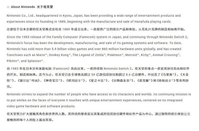 “自1983年在日本推出Family Computer(红白机)系统以来,直至如今的Switch 2,任天堂始终专注于游戏硬件与软件的研发、制造和销售。”任天堂在声明中表示,“截至目前,我们已在全球售出超过59亿份游戏软件及8.6亿台硬件设备,并创造了包括《马里奥》《大金刚》《塞尔达传说》《宝可梦》《密特罗德》《星之卡比》《动物森友会》《皮克敏》和《斯普拉遁》在内的经典系列。”