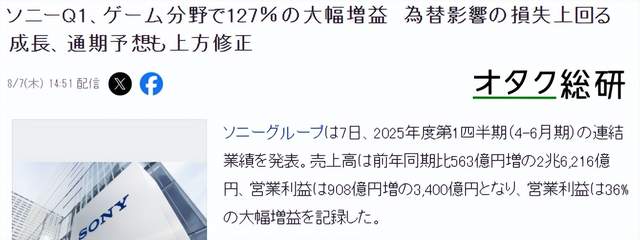 索尼集团日前公布了2025年4~6月期的公司收益情况,整体销售收入相较去年同期增长563亿日元,达到26216亿日元,整体利润达到3400亿日元,交去年同期增长36%。