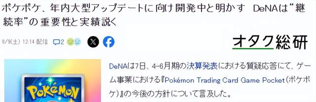 DeNA社日前发布新财报,透露了与宝可梦社合作开发运营的系列手游《宝可梦TCG Pocket》大型更新正在开发中,预计今年内发布,敬请期待。