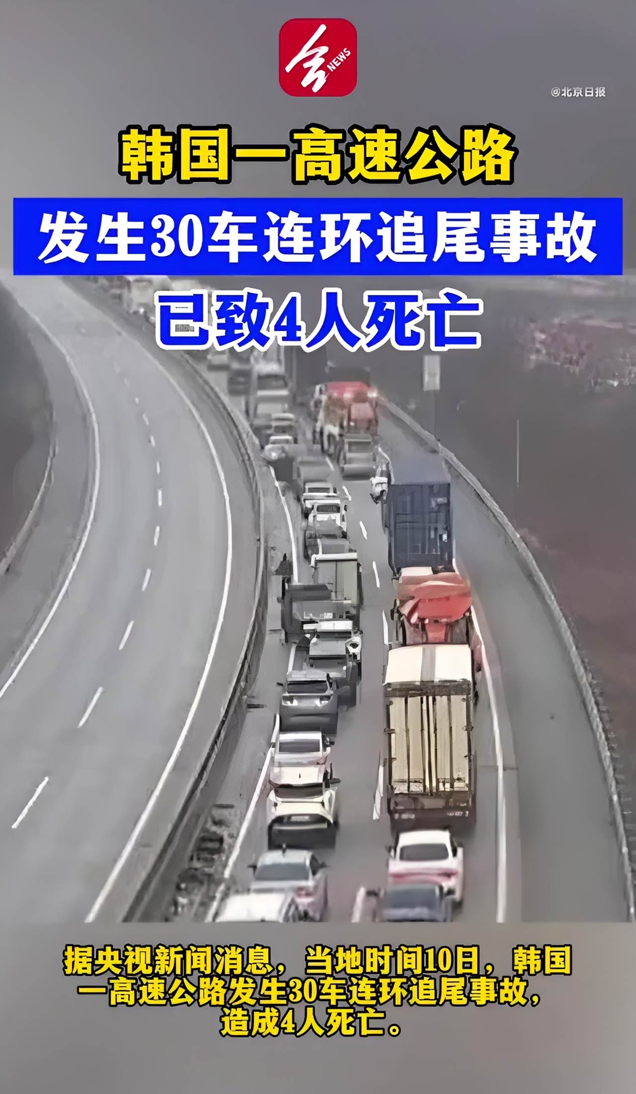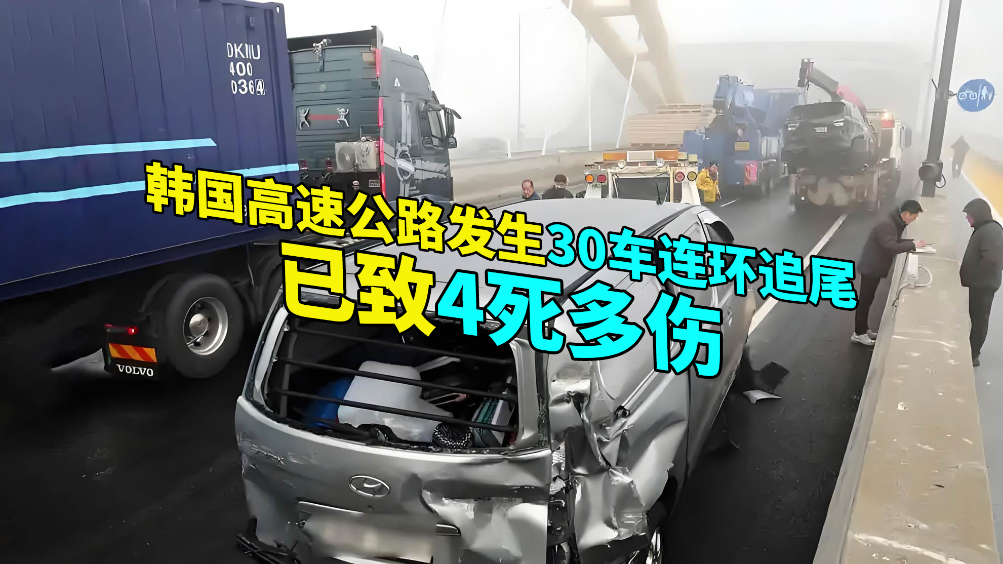 当地时间1月10日清晨,韩国一高速公路突发重大交通事故,30辆汽车在恶劣天气条件下发生连环追尾,造成4人死亡,多人受伤,现场救援工作迅速展开。