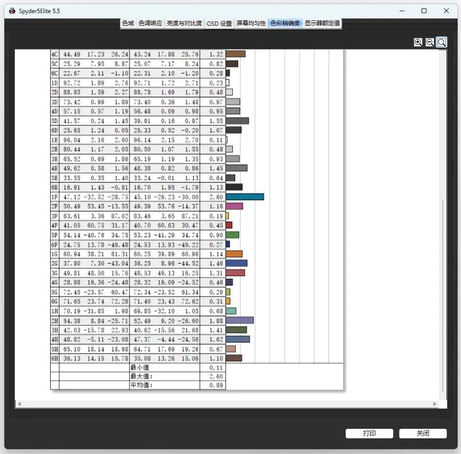 色彩精准度的实测表现同样可圈可点。在默认用户模式下,通过 48 色标准色彩精准度测试,微星 MPG 271QR QD-OLED X50 显示器的色准 ΔE 值最小值低至 0.11,最大值为 2.6,平均 ΔE 值仅为 0.89。