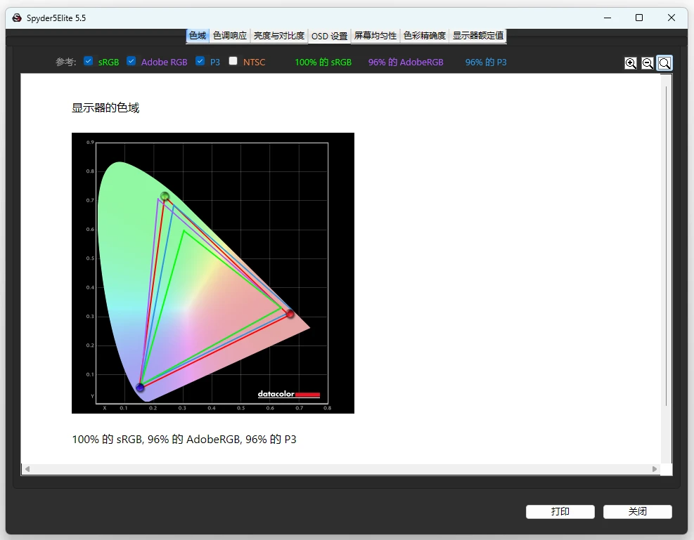 实测数据层面,借助红蜘蛛校色仪的专业检测,微星 MPG 271QR QD-OLED X50 显示器在默认用户模式下的色域表现十分亮眼:sRGB 色域实现 100% 全覆盖,AdobeRGB 与 DCI-P3 色域覆盖度也分别达到 96%,实测数据与官方标称值基本吻合,充分印证了其专业级的色彩覆盖能力。