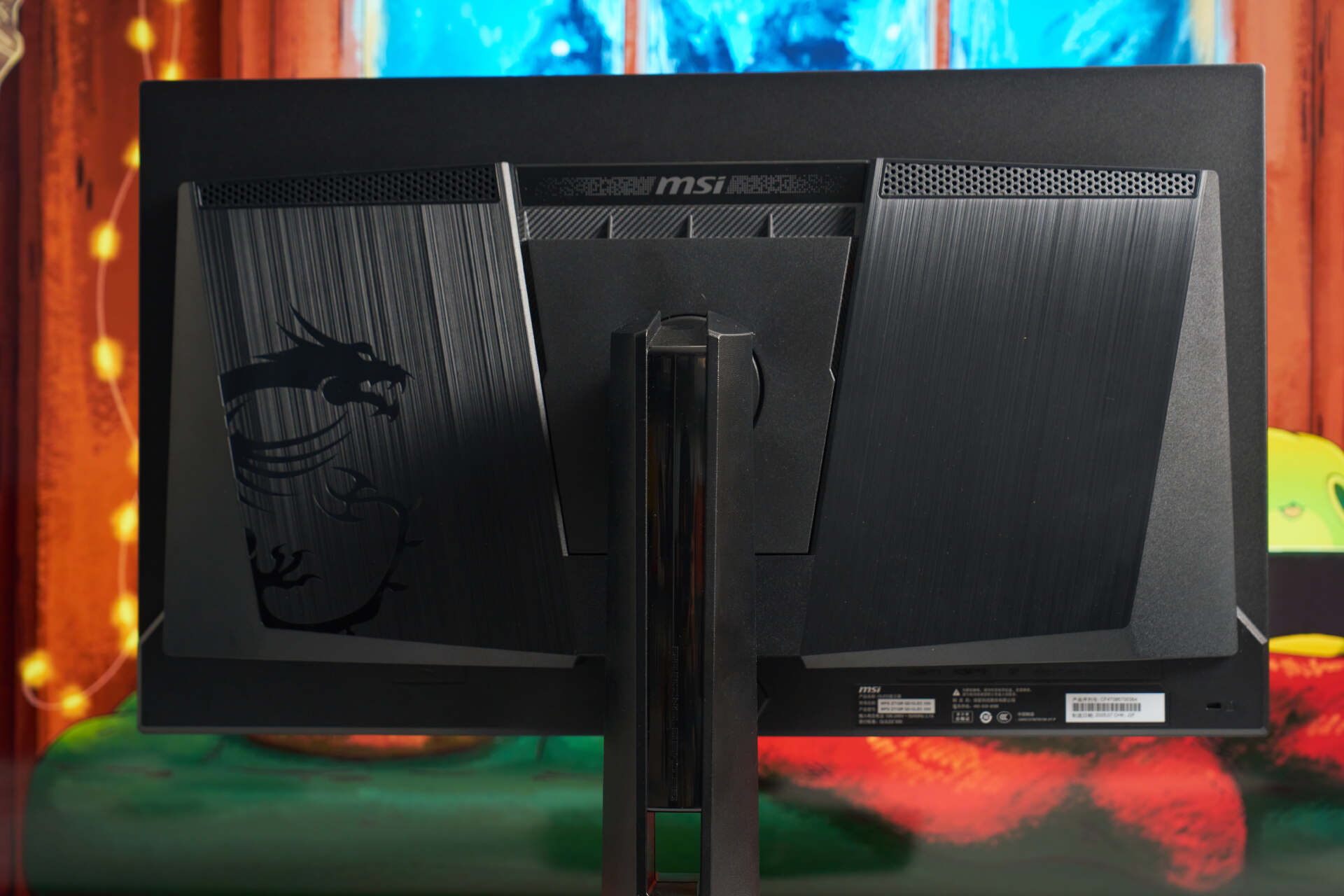 在背部设计上,微星 MPG 271QR QD-OLED X50 同样延续了家族化风格。背板采用金属拉丝工艺打造,不仅带来细腻且富有质感的触感,同时也能辅助机身散热;左侧醒目的龙盾标识作为品牌标志性元素,既强化了产品辨识度,也为简约的背部设计增添了一抹电竞属性。