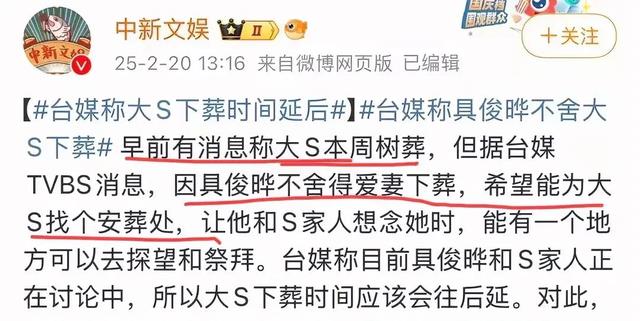 不过现在还没有确定具体的位置,可以肯定的是,大S的安葬时间肯定会推迟。