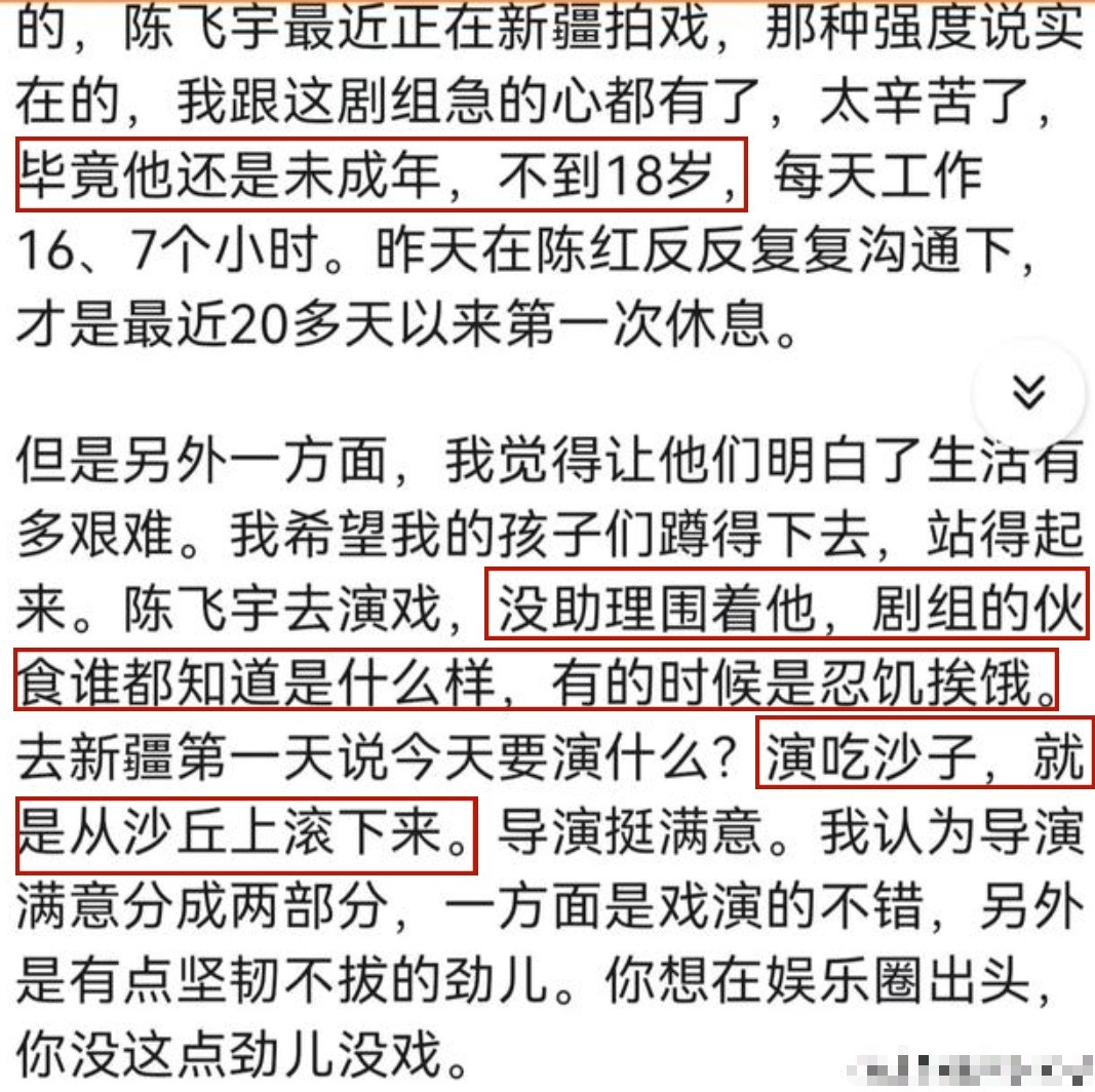 陈凯歌就曾爆料拍摄《将夜》时,陈飞宇连续20多天没有休息,还在沙漠里滚来滚去,当时的他不过17岁,还是未成年。