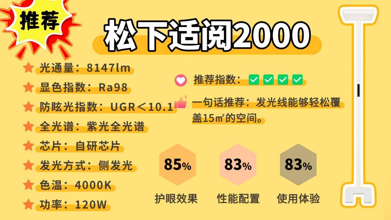 护眼大路灯哪个牌子好用?松下适阅2000这款护眼大路灯和书客一样都是采用紫光全光谱激发技术的护眼大路灯,并且补全了红光,实际的光线舒适度比较高,另外其矩形的发光面也是经过上下双向发光设计,并且搭配防眩光技术有效减少眩光,实际防眩光指数只有UGR<10.1,并且其发光线能够轻松覆盖15㎡的空间内,宽广的光线也能够进一步有提升视觉舒适度,不过,松下在价格上波动较大,存在一定的价格争议。