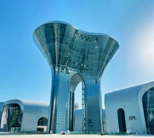 位于“花蕊”部分的中心文化塔高达77.7米,地上9层,地下2层。中心塔并不算高,却因周围开阔的广场和建筑体量的对比,显得格外引人注目。行人置身其中,似乎步入科幻场景,未来感十足。塔内设有商业区域和观光层,游客可乘电梯直达高处,俯瞰会展片区全景,领略乌鲁木齐的城市风貌。