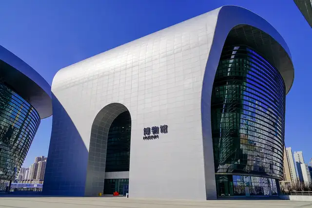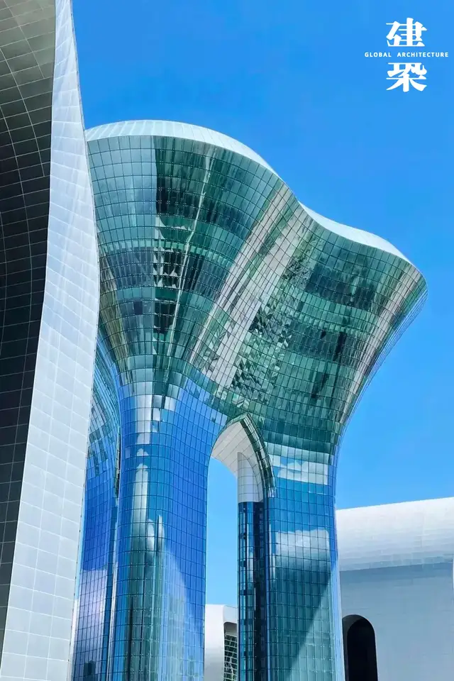 建筑外立面以玻璃幕墙与银灰色铝板相结合,既呼应雪莲的洁净意象,也融入了节能环保的理念,体现出对可持续发展的重视。