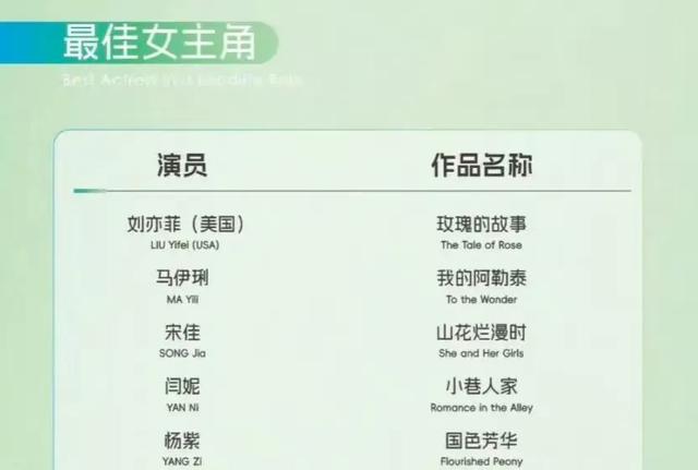 和宋佳一起入围最佳女主角的有:闫妮《小巷人家》、杨紫《国色芳华》、马伊琍《我的阿勒泰》、刘亦菲《玫瑰的故事》。