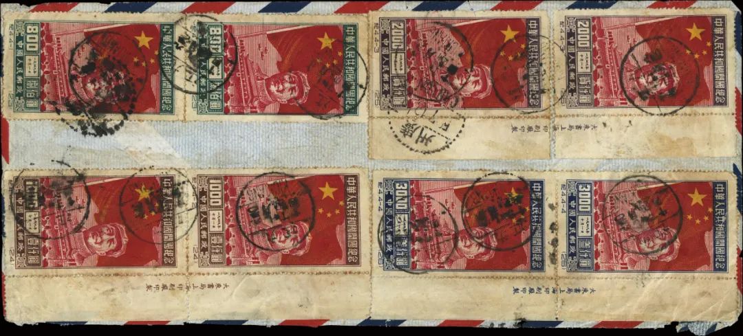 1950年九江航空寄美国封1件,正贴华东区、华中区票4枚,背贴纪4开国直双连全套(3件带完整厂铭边,4-1不带厂铭),合资15800元,销7月14日九江戳,盖7月15日南昌戳、7月18日广州戳,保存较好。该封为国际平信邮资、航空费邮资双调资尾日封,国际平信邮资于7月15日改为2800元,国际航空邮资改为11700元。此封实寄于纪4发行第14天,且纪4(4-4)双连带厂铭者仅见此件,该航空邮资仅使用1个月,为短期邮资,非常难得,该封集国际双调资尾日与纪4原版厂铭双连于一体,是组集纪4邮政史的极佳素材