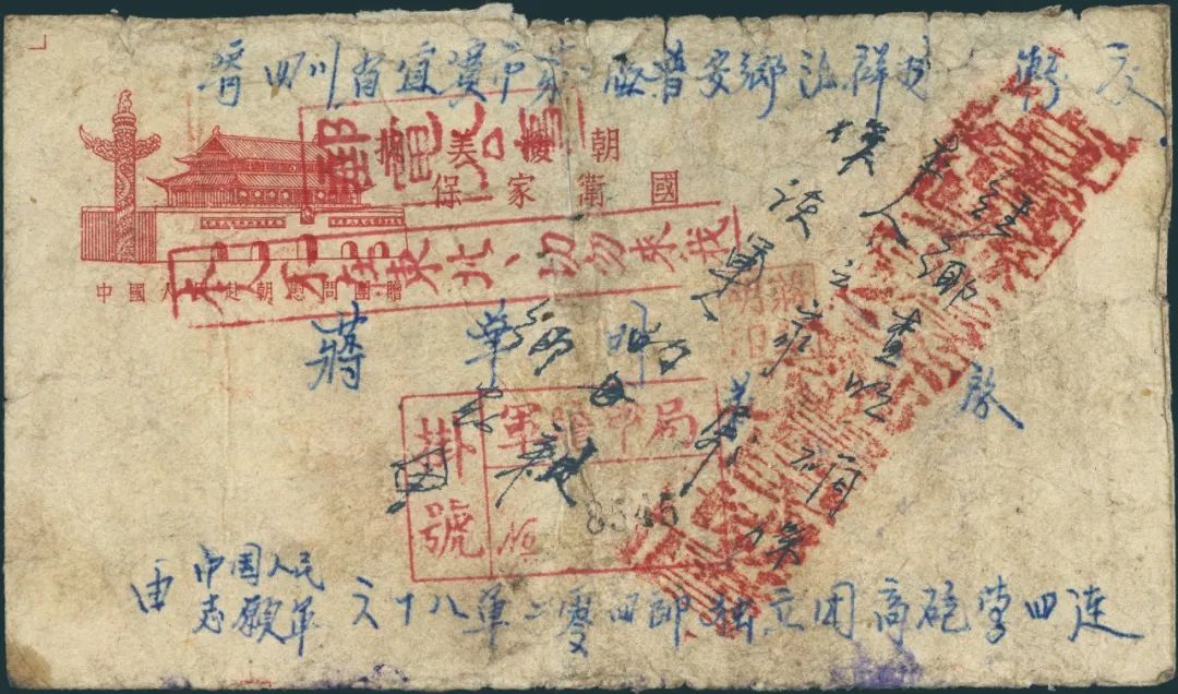 1953年志愿军第六十八军二零四师寄宜宾挂号军汇封一件,信封均为中国人民赴朝慰问团赠军邮封,盖邮电公事戳,分别盖蓝色、红色军瞻甲局挂号戳,因寄信人赴朝作战,为说明情况,另盖“本人不在东北,切勿来找”副戳,到宜宾后另盖宜宾县共和乡农民协会章,戳记清晰,保存较好,志愿军“邮电公事”封罕见