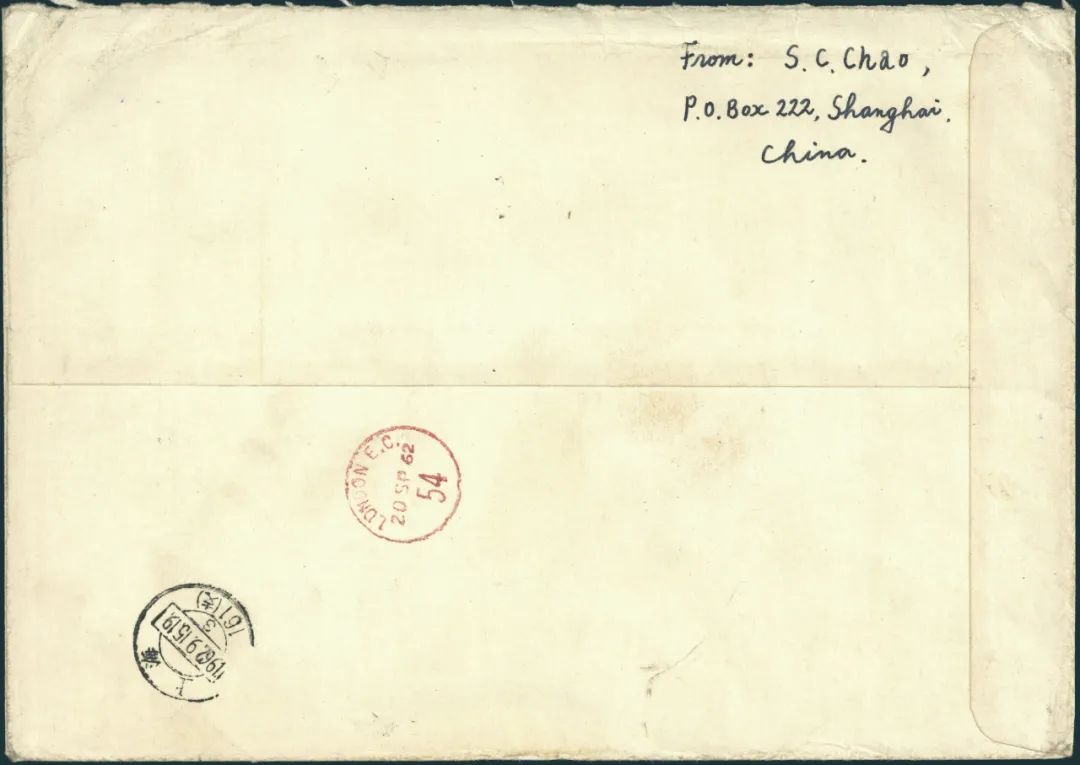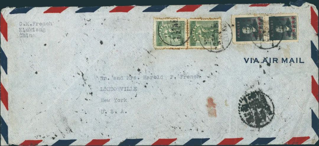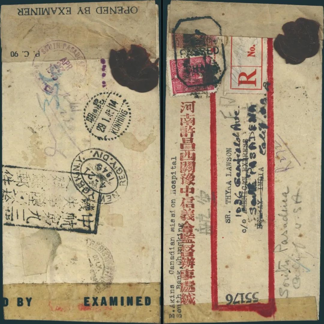 1945年1月16日凌晨,一架美国道格拉斯C47运输机从重庆飞往昆明,由英国王牌飞行员王国书(George Wong)驾驶的中国航空公司的第93号航机。然而,那一夜天气变化莫测,狂风、暴雪和强劲气流,最终在离昆明仅100公里远的“牯牛山”上撞山坠毁。飞机残骸被搜救队运回昆明,这件信件被捡回巫家坝机场的航空邮运大队。由于飞机失事导致邮运时间的延迟,信封背面被盖上“中航第93号机失事坠毁拾获之残余邮件”黑色方框戳记及1945年1月29日昆明(庚)点线戳,随后由其他邮路经过2个半月才运送到美国,该件封为唯一一件带双检查改寄的空难封