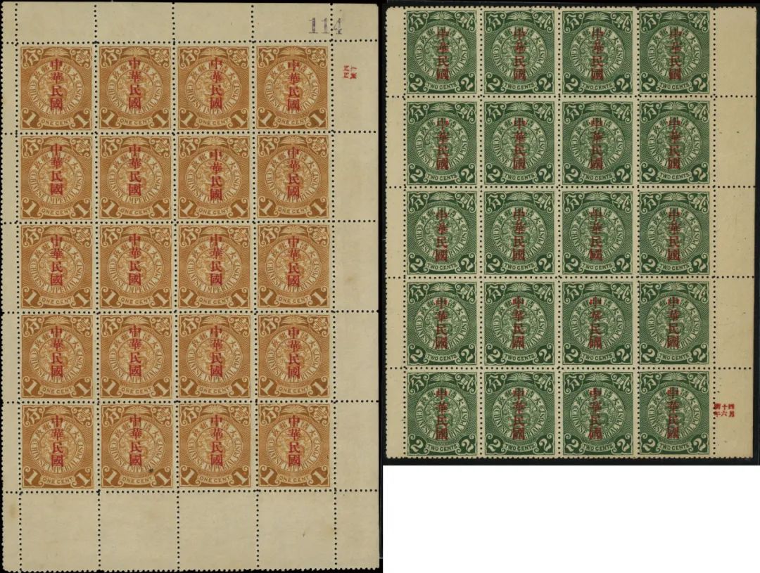 1912年蟠龙加盖大国字“中华民国”带边20连新票全套,2枚成套,边纸上均有红色日期号,蟠龙全格带日期号者十分稀少,原胶,上品