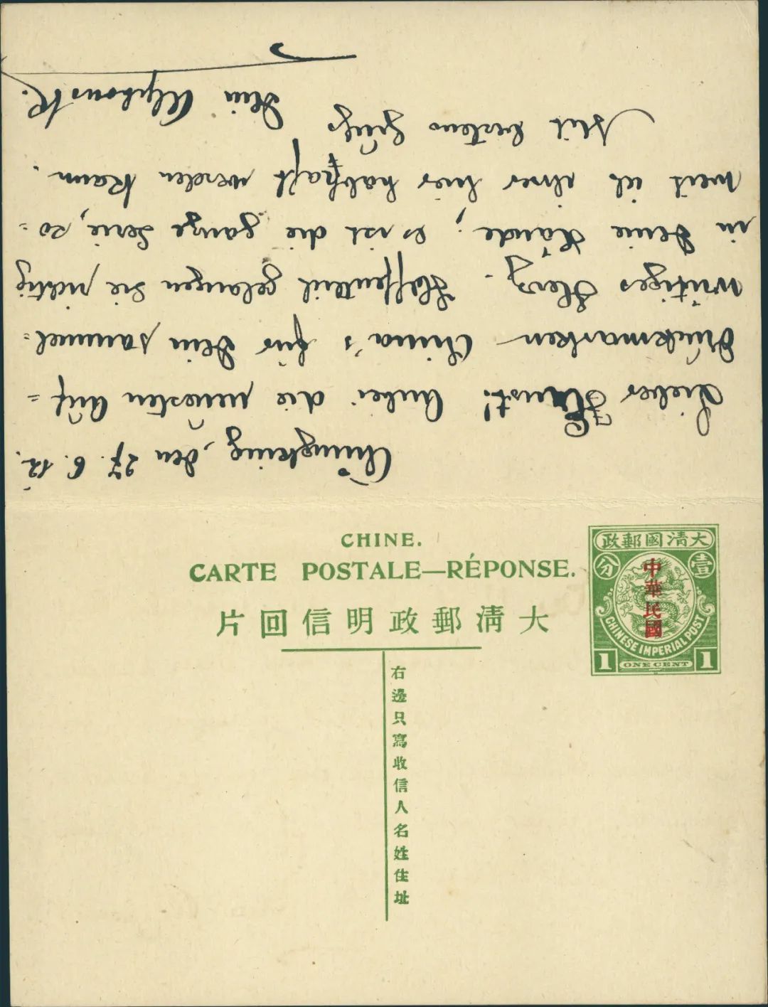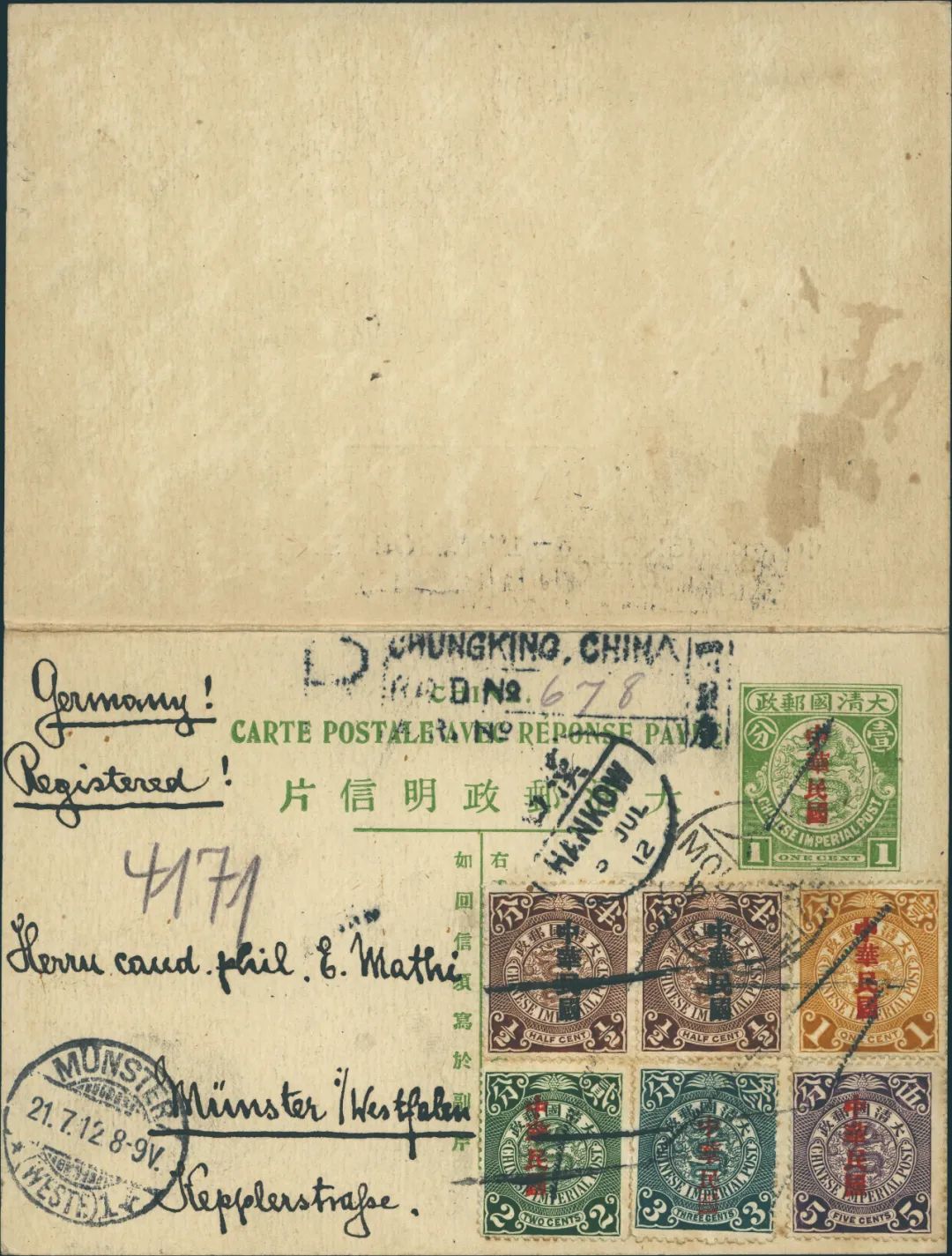 1912年清四次邮资片双连加盖宋体中华民国1件,重庆挂号寄德国,加贴蟠龙半分加盖宋体中华民国票2枚,1分、2分、3分、5分加盖宋体中华民国票各1枚,重庆局漏销,到汉口局用戳边滚销,盖7月5日汉口小圆戳、7月10日奉天小圆戳、7月21日德国到达戳,另盖四川重庆中英文挂号戳记,保存较好。该片由重庆经长江邮路到武汉,转而北上由西伯利亚铁路寄德国